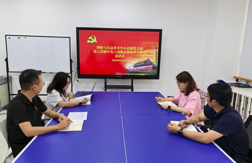 9月18日,网络与信息技术中心直属党支部在部门会议室召开深入贯彻中央八项规定精神学习教育总结会,传达学习习近平总书记关于作风建设的重要指示精神,全面总结支部学习教育情况,部署推进作风建设常态化长效化工作。